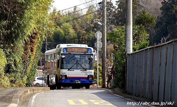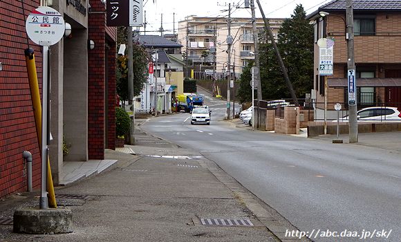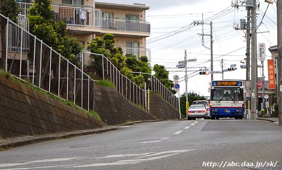 | 梨園停留所から公民館停留所に掛けては、傾斜の急な坂を通過する。 [高01]高根公団駅行。 1410 梨園-公民館にて 2016年11月26日 |