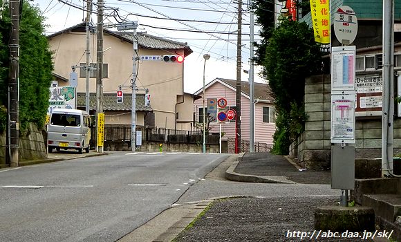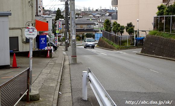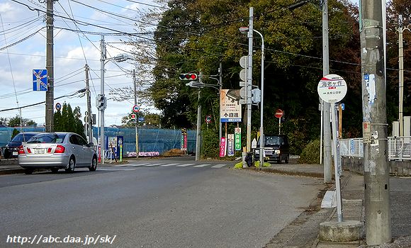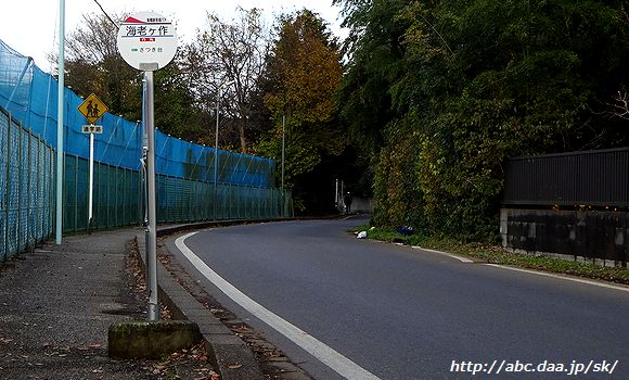| 海老ヶ作の高根公団駅方面停留所。 ここから先は大穴小学校停留所まで上下線が分岐し、それぞれ一方通行の道を通行する。 海老ヶ作にて 2016年11月26日 |