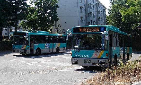 | 非常に狭いロータリーとなっているが、三咲駅が起終点となる便については写真の位置にバックで入庫して待機する。 1010 三咲駅にて 2016年4月3日 |