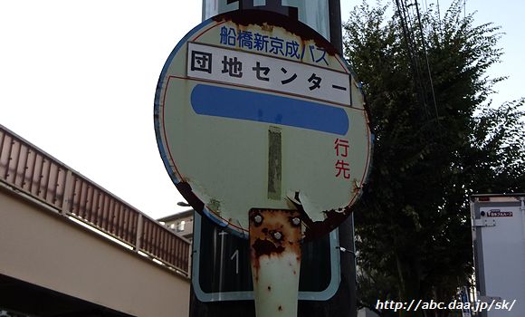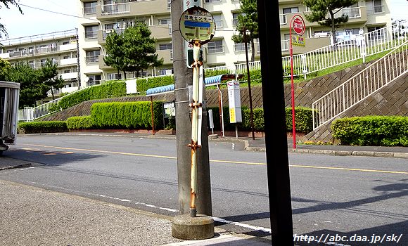 | 「団地入口」の下り停留所は、懐かしの新京成電鉄自動車部時代のポール。(撮影日現在) 団地入口にて 2016年11月1日 |