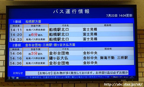 | 2022年3月18日までは、御滝不動行・三咲駅行・鎌ヶ谷大仏行はD乗り場でした。 船橋駅北口にて 2019年7月20日 |