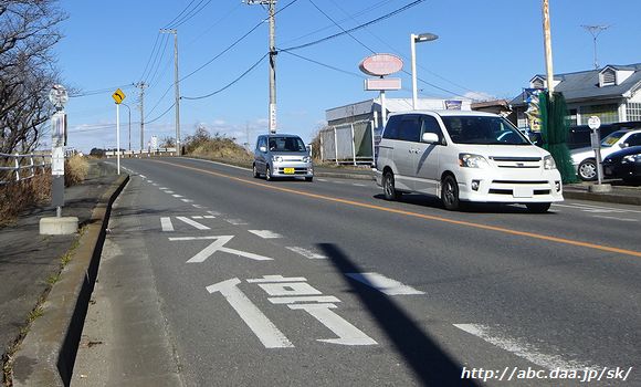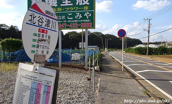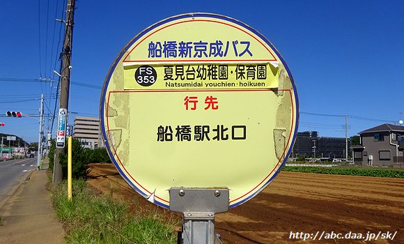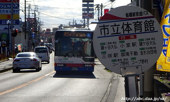 | 鎌ヶ谷大仏始発の船橋駅北口行は、横断歩道を渡って、通りの反対側の乗り場から。 三咲駅にて |