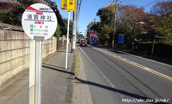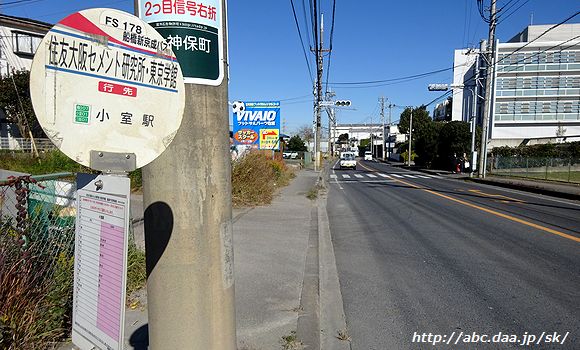 | 1時間に1本の船橋駅北口行と、1時間に1本の北習志野駅行で、1時間に計2本のダイヤでパターン化されている小室駅停留所。 [船07]三咲駅経由 船橋駅北口行。 1048 小室駅にて 2016年11月9日 |