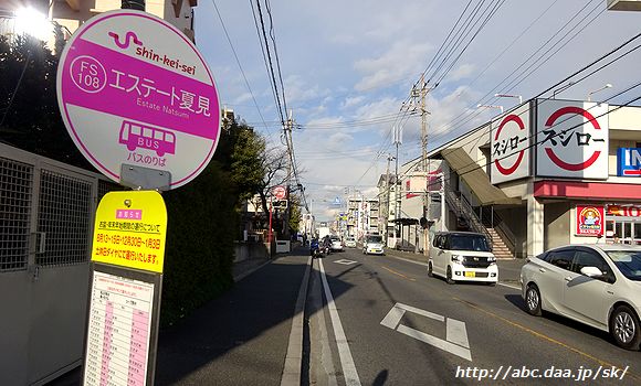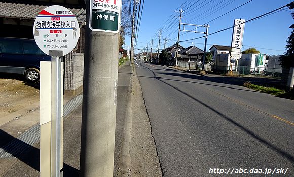 | 三咲駅始発以外の船橋駅北口行は、横断歩道を渡って、通りの反対側の乗り場から。 三咲駅にて |