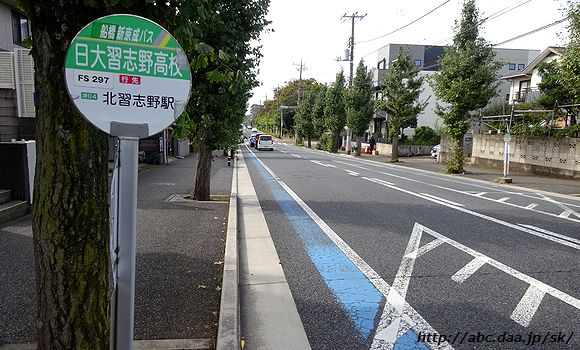 | 北習志野駅〜北習志野駅入口の区間では、鎌ヶ谷営業所の車両と、習志野営業所の車両の両方が乗り入れるが、この区間では独特なデザインのバス停が見られる。 第一小学校前停留所では、赤い電照式ポールを使用。 第一小学校前にて 2016年9月28日 |