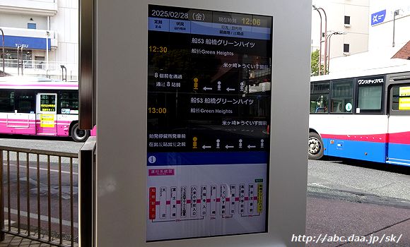 | 時刻表・運行系統図は、アナログに外付け。 船橋駅北口にて 2025年2月28日 |