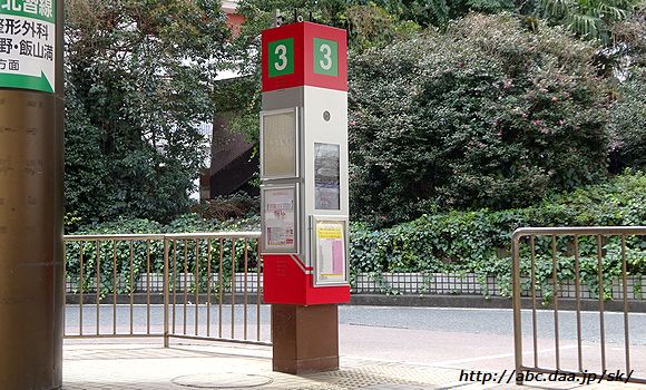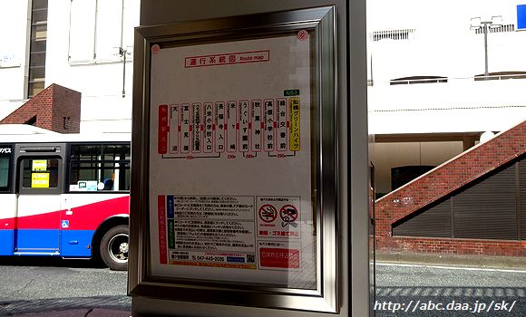 | 新京成バス最大のターミナル船橋駅北口の隣り「天沼停留所」には、豊富線・夏見線・建鉄線・小室線・金杉台線・鎌ヶ谷線・船橋グリーンハイツ線・船橋行田線・芝山線が乗り入れる為、時刻表が10種も掲示されている。 天沼にて 2016年4月6日 |