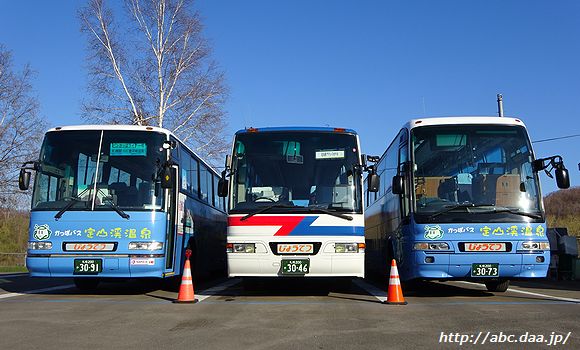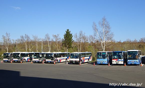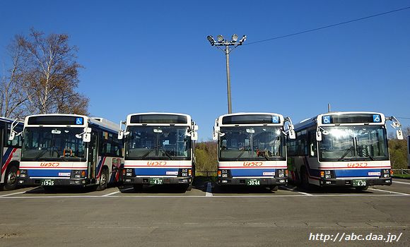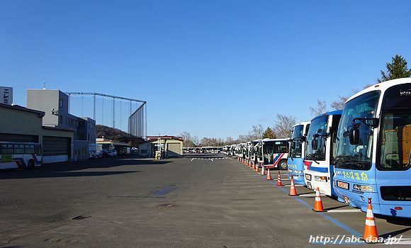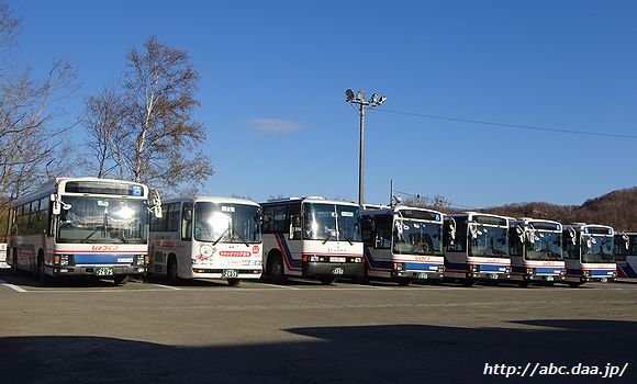路線車・かっぱライナー専用車両・貸切車が並ぶ、川沿営業所。 2016年4月27日 |