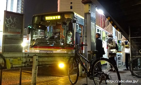 渋谷駅発の最終深夜バス[渋21]桜小学校行が出発する頃、ミッドナイトアローの運行が始まる。