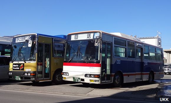 元東急バスのF-991と並ぶ、生え抜きF-021。 2014年3月15日 上田営業所にて |