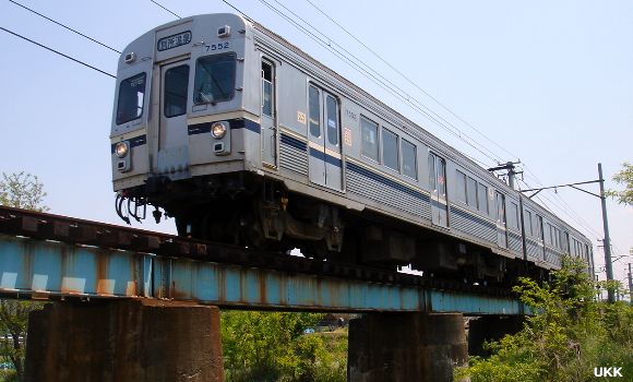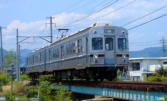 産川の橋梁の別所温泉寄りから撮影した1枚。 別所温泉行の列車は橋梁の下から狙う事が出来るので、このようなアングルでの撮影が可能。 下之郷-中塩田にて 2008年5月16日 |