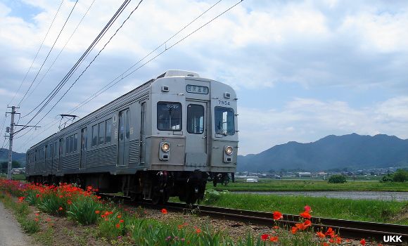 別所線沿いにある公道から撮影。 線路沿いに花が植えられている為、それらを入れると季節感のある写真が撮影できる。更に遠くの山並みを入れる事も可能。 下之郷-中塩田にて 2008年6月13日 |