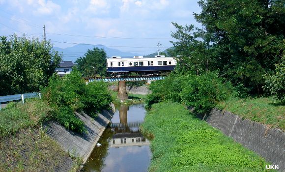 産川を渡るまるまどりーむ号。 下之郷-中塩田にて 2008年8月7日 |