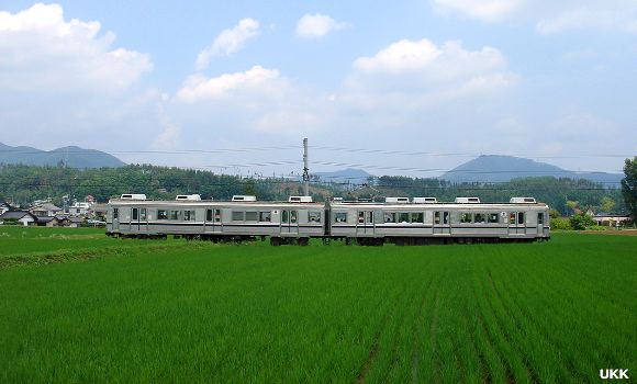 舞田駅を別所温泉方面に走り出した列車は、周りに何も無い水田の中を行く。 沿線に道路や建物が無く、障害物が何もない所で、少し離れた場所を通る農道から撮影。 舞田-八木沢にて 2008年6月28日 |