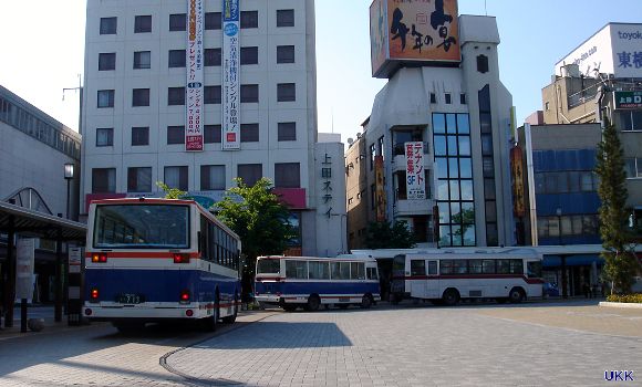 写真のようにバスが並び次々とお客を乗せて行く。 2007年10月24日 上田駅前にて |
