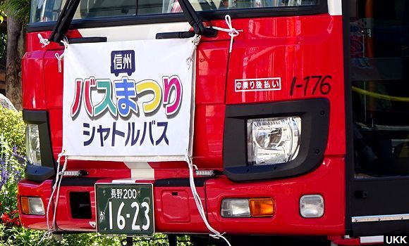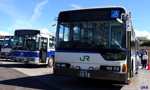 | まずは、上田駅からシャトルバスで会場へ移動。 上田駅お城口から会場である上田バス本社まで、千曲バスと上田バスがシャトルバスを運行しました。 I-176・I041 上田駅前にて 2018年9月16日 |