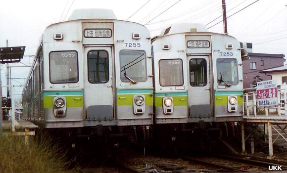 ◆7200系の方向幕の話 7200系に搭載されていた方向幕は以下の通り。 「上田・別所温泉」「上田・下之郷」「上田」「別所温泉」「下之郷」「中野」 「快速上田」「快速別所温泉」「臨時」「試運転」「回送」「上田・別所温泉」「上田・下之郷」 基本的には必要最低限に絞られている印象だが、 ワンマン運転開始当初に使用された往復幕が最初と最後の2つ用意されているのが特徴だろうか。 別所線の車両が7200系に世代交代してからも快速列車は上りのみしばらく運行が継続されていたので、 「快速上田」は使用された事があるが、下りの快速は7200系導入前に廃止されていたので、 「快速別所温泉」は一度も使用された事が無い模様。また「中野」の表示も未使用である。 |