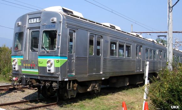 メンテナンスコストが抑えられるオールステンレス車体に 冷房完備と申し分ない物である事から非常に重宝されている為、 上田の地で5000形の3倍程度は長生き出来そう。(上田にて) |