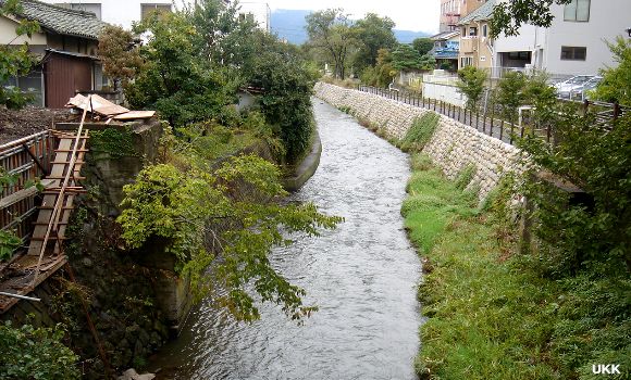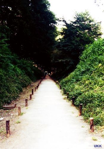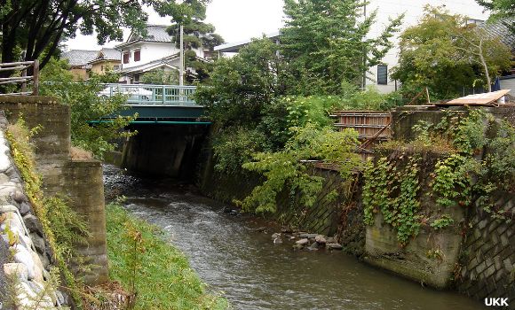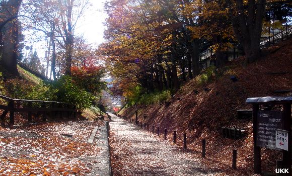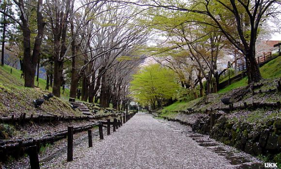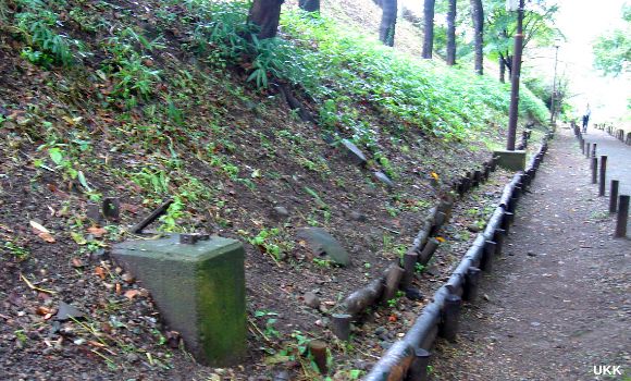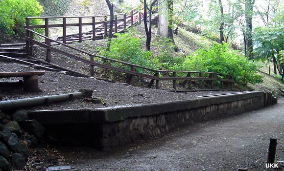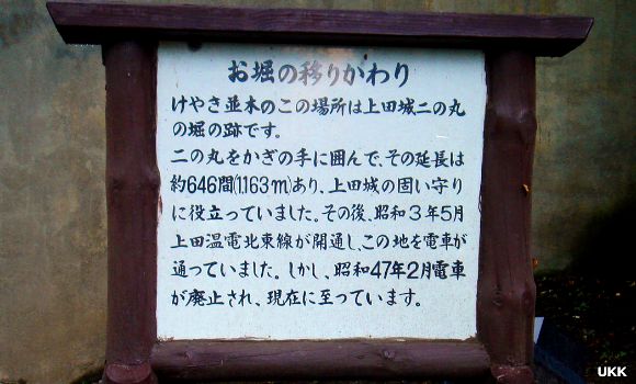 上田-公園前 線路跡が上田城のお堀の中に今も残る。 |