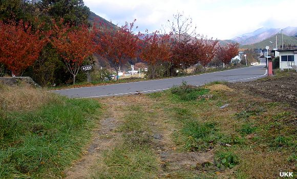 曲尾駅跡。 現在は普通の道路ですが、道端にある標識が目印です。(写真中央やや左) 2009年11月13日 |