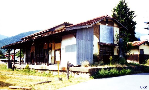 傍陽駅跡。傍陽駅の駅舎は廃線後も完全な形で長らく存続し、駅の待合室が上電バス傍陽線の待合室として利用されていた。 |