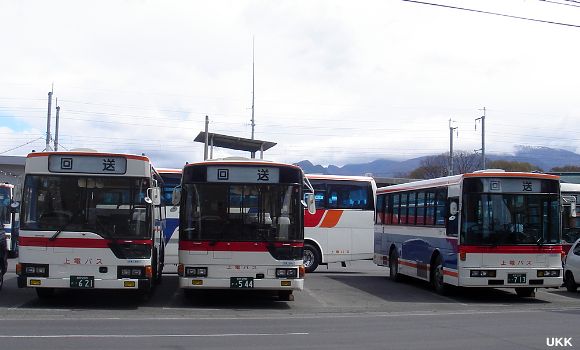 上田駅お城口から回送表示で上田営業所に向かうN-932と、後方のF-023。