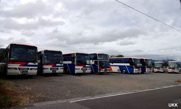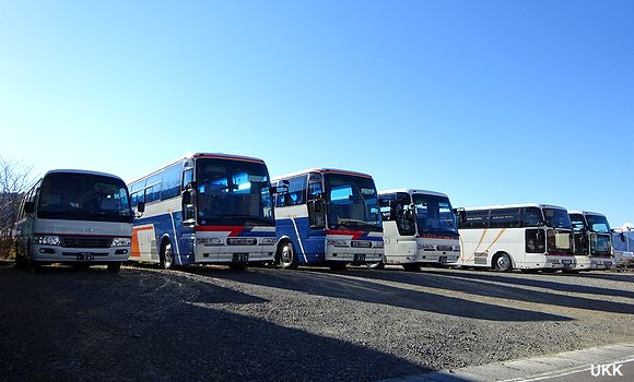 ラッピング車やオリジナルカラーなど、路線車・貸切車が一同に介す上田営業所。